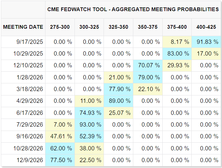 根据CME的美联储观察工具,利率市场已假定9月17日降息25个基点几乎是定局。一些特别热衷于降息的交易者还在定价超过17%的可能性,即美联储将受到数据或政治压力的影响,在下周实施50个基点的降息。