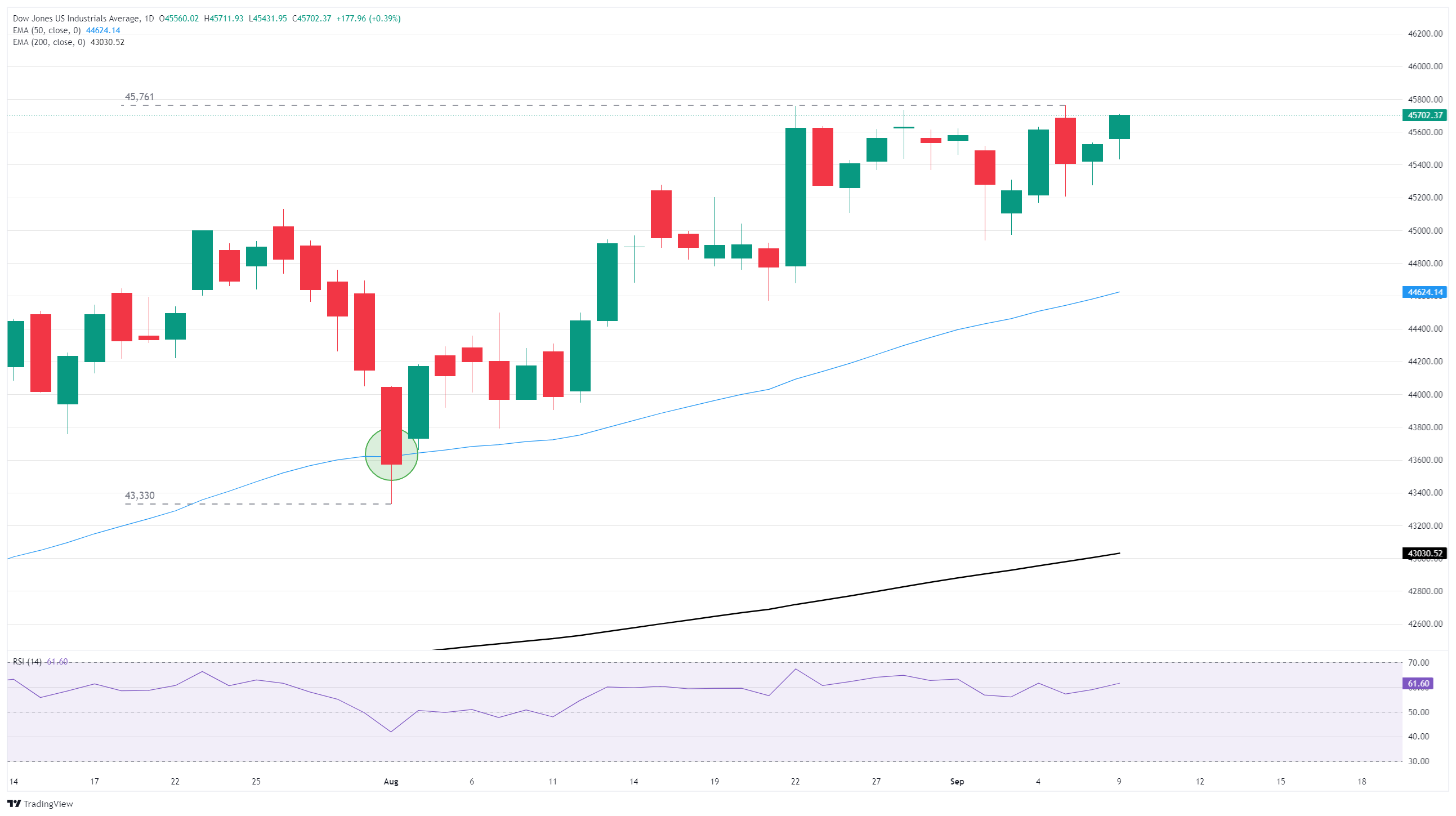 在短暂的反覆猜测后,道琼斯指数已升至45700区域,降息的希望提振了市场情绪。整体而言,股市保持平静,投资者為美联储在9月17日的下一次利率决策做好了长期等待的准备。