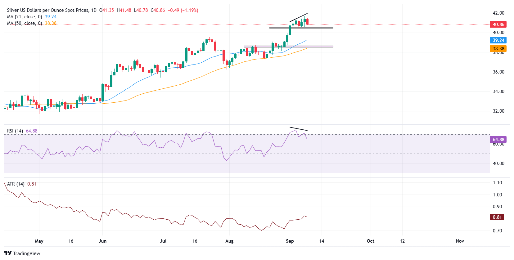 白银价格预测:白银/美元在41.50美元下方整固,带有看跌的相对强弱指数背离
