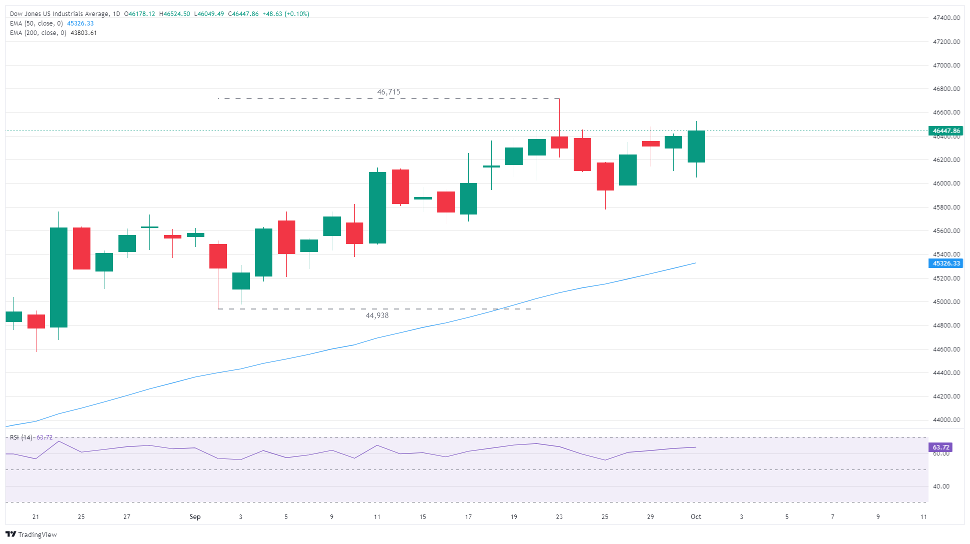 - 道琼斯指数在美国政府停摆的情况下仍然接近46,500点。