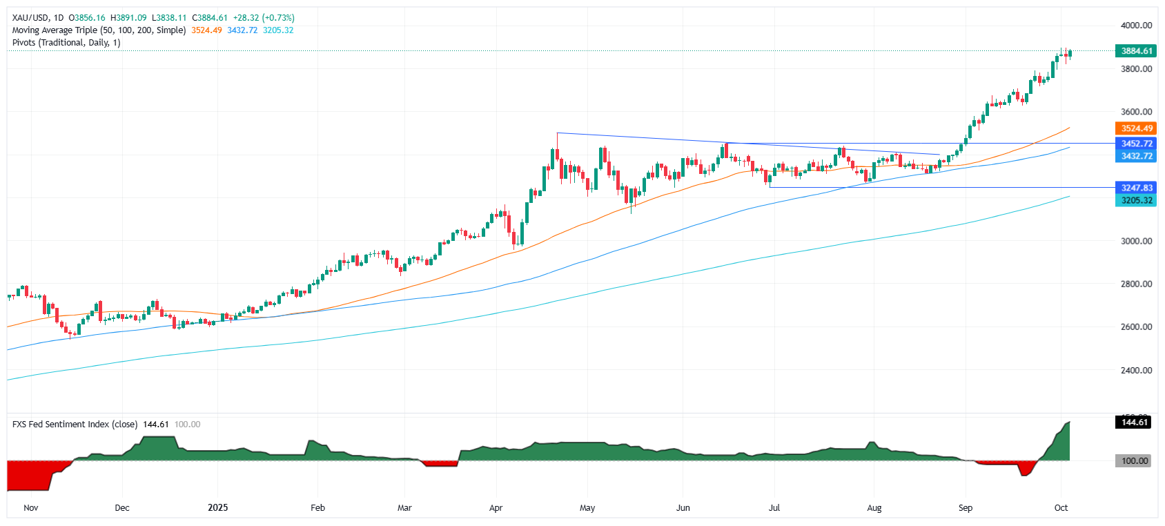 如果黄金/美元突破3895美元,立即阻力位将是3900美元,随后是3950美元和4000美元的关口。相反,若跌破3830美元,将暴露出10月2日的低点3819美元,接下来是3800美元的关口。下方,下个关注区域将是20日简单移动平均缐(SMA)在3729美元。
