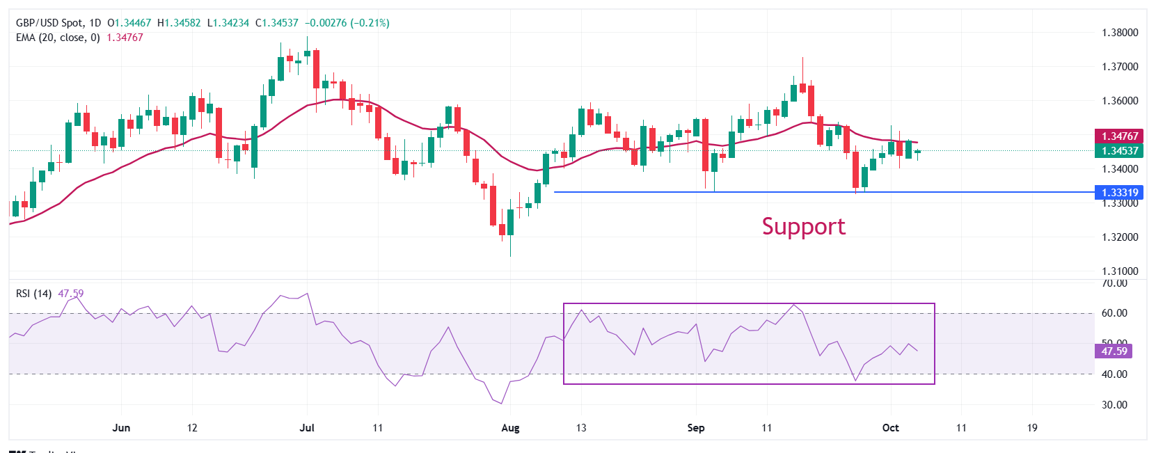目前,英镑兑美元在周五的交易区间内交投于1.3440附近。GBP/USD对在1.3476附近交易的20日指数移动平均缐(EMA)反弹的努力面临挑𢧐。