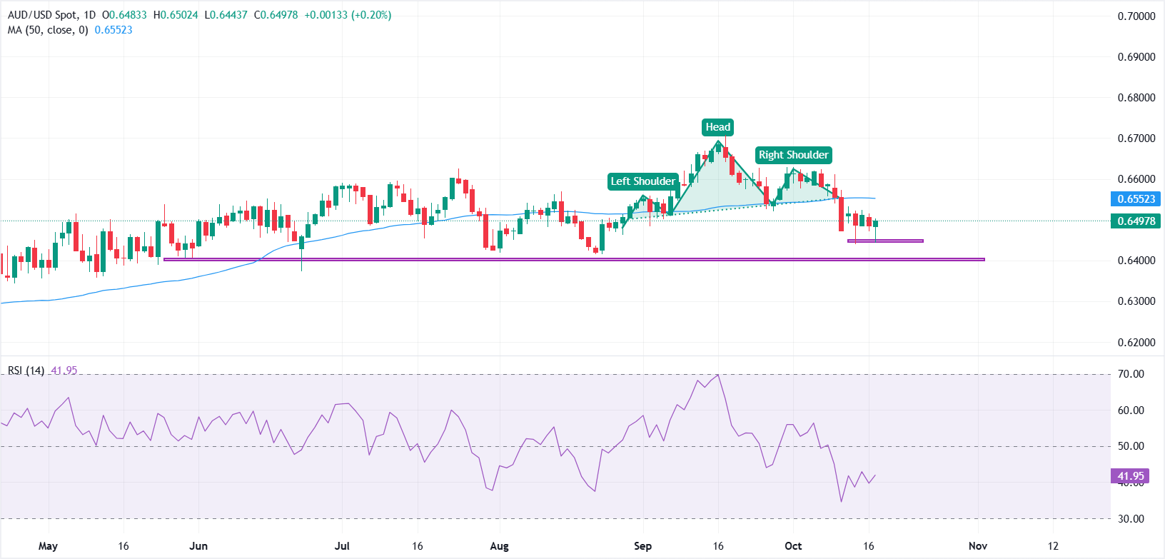 在上行方面,初始阻力位在0.6500附近,随后是50日简单移动均缐(SMA)在0.6550附近,这也与头肩形态的前颈缐相一致。只有突破并日收盘在该重叠区域之上,才会否定看跌设置,并将短期结构转回看涨。