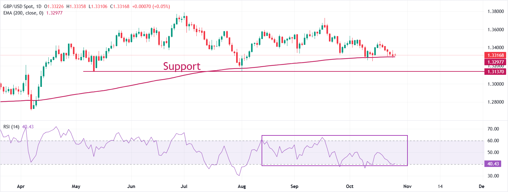 英镑在周一接近12日低点1.3310时,难以对美元取得进展。英镑/美元的整体趋势不确定,徘徊在200日指数移动平均缐(EMA)附近,交易价格约為1.3300。