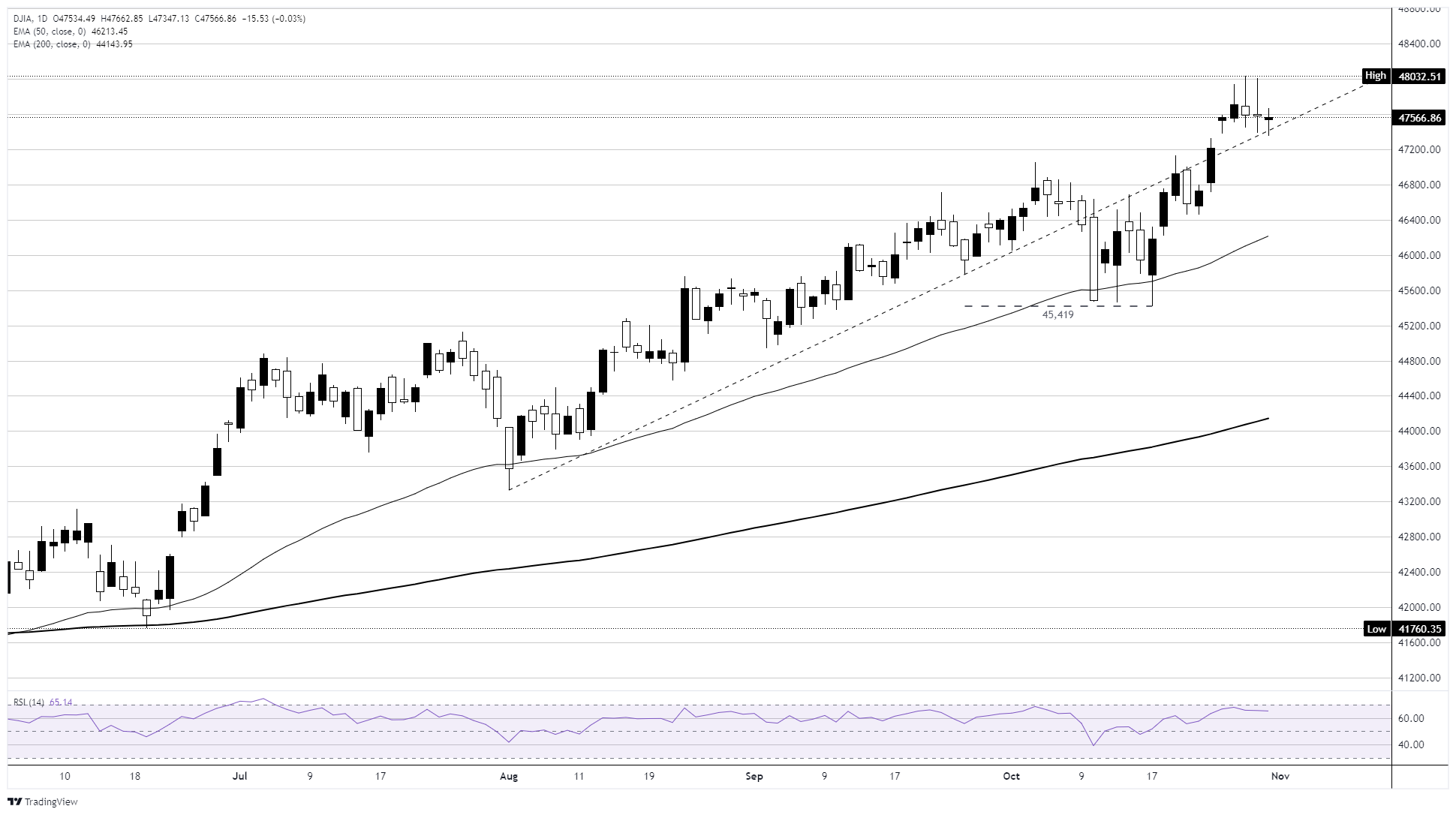 道琼斯工业平均指数(DJIA)有望在本交易周结束时接近其起始点,价格走势在47,500区域徘徊。侭管美联储(Fed)本周实施了广泛预期的降息,并且道琼斯创下了48,000以上的新历史高点,但股市整体上仍然不為所动。本周的看涨动能一直较弱,市场对美联储谨慎的降息语气感到失望,但对特朗普政府普遍不𫖸意兑现其威胁的希望又有所抵消。