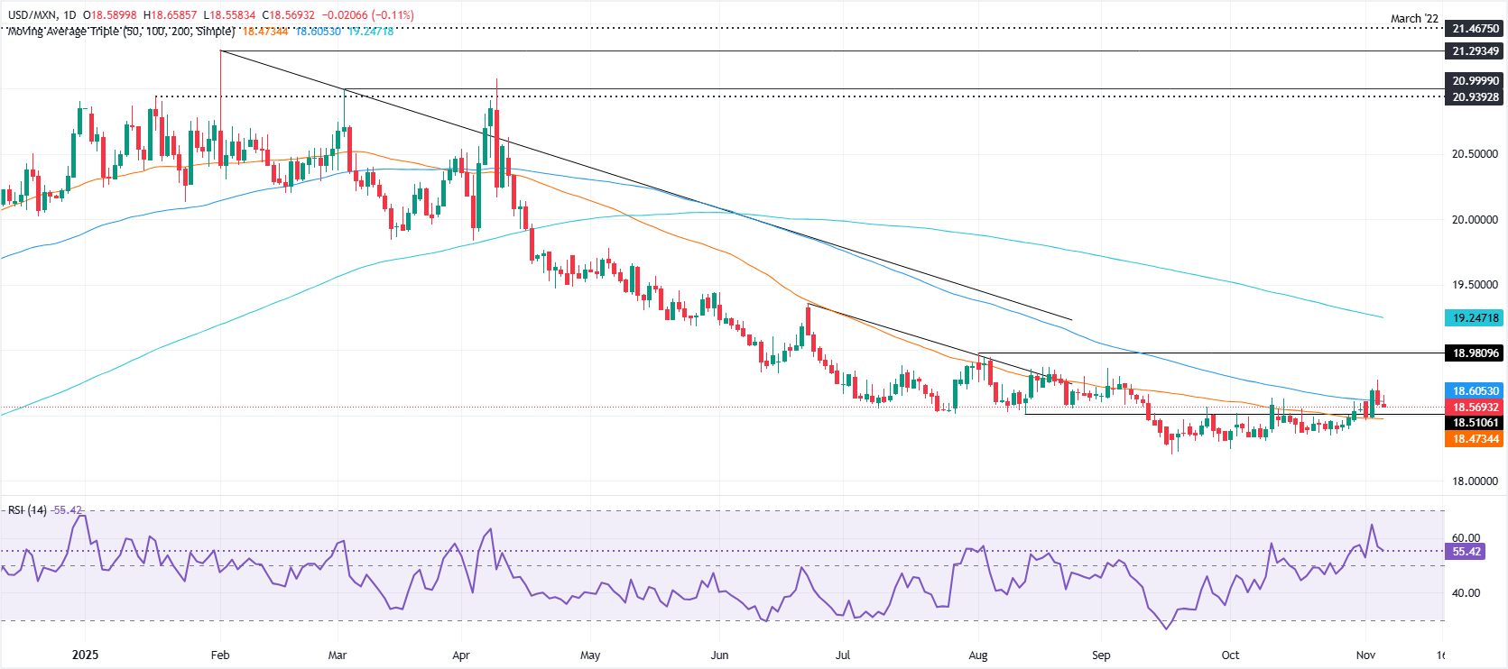 在这一决定后,美元/墨西哥比索从约18.59下跌至18.57,但仍未测试日低18.55。突破后者可能会暴露出20日和50日简单移动平均缐(SMA)在约18.46/48的交汇点,然后测试年低18.19。在进一步走弱的情况下,18.00的里程碑在前。