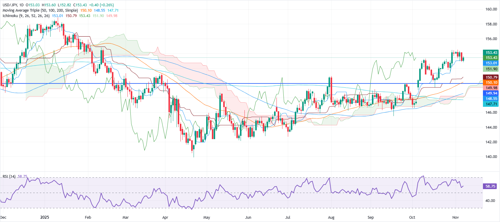然而,𧹒家仍然主导市场,RSI显示了这一点。也就是说,如果美元/日元上涨至154.00以上,下一阻力位将是11月4日的高点154.48,随后是155.00。