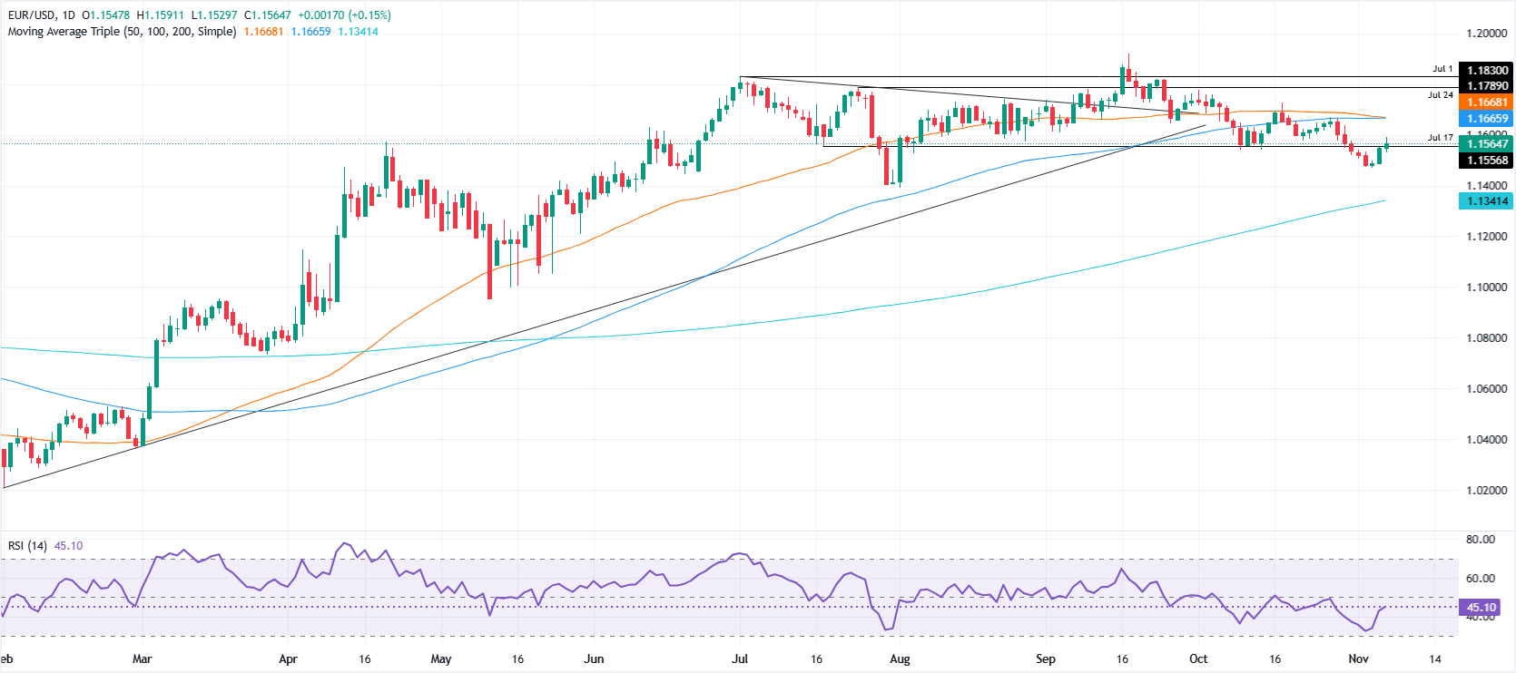 侭管𧹒方如RSI所示正在积聚动能,但只要该指标处于看跌状态,卖方仍占上风。因此,如果欧元/美元跌破1.1500,预计将测试8月1日的周期低点1.1391。