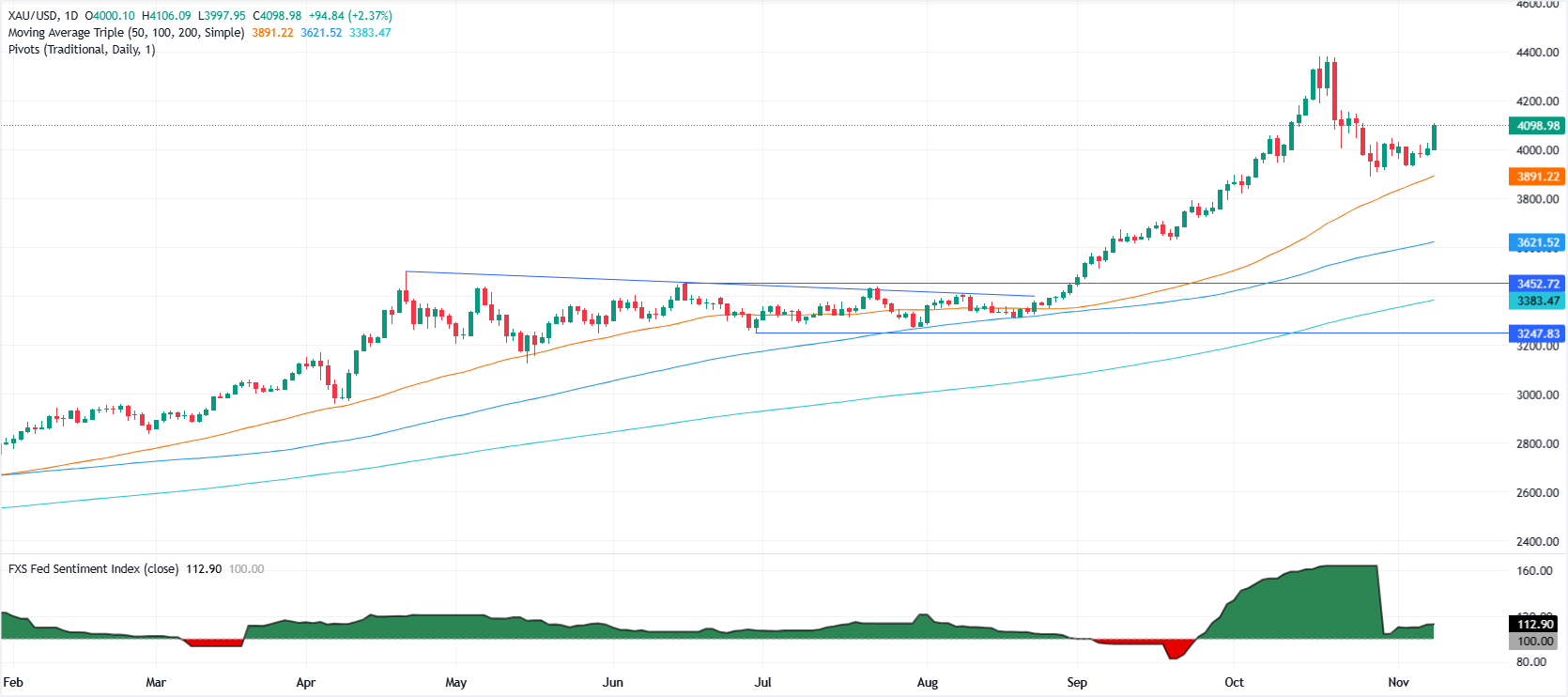 关键阻力位在4100美元。突破后将暴露出10月22日的高点4161美元,随后是4200美元。相反,若跌破4000美元,将暴露3950美元,随后是10月28日的低点3886美元。