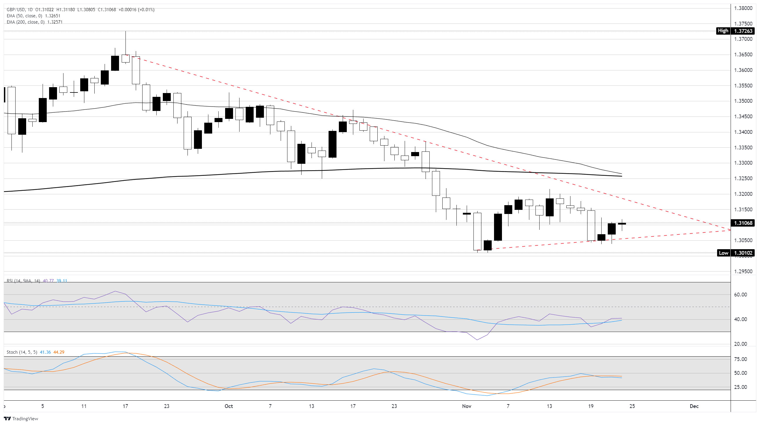 周一,英镑/美元失去动能,维持在1.3100附近,因為投资者在应对极短的一周。由于美国感恩节假期,周四美国市场将关闭,周五美国市场也将提前关闭,这实际上将限制英镑/美元交易者仅有三天的交易周,且大西洋两岸的市场将在同一时间𫔭放。