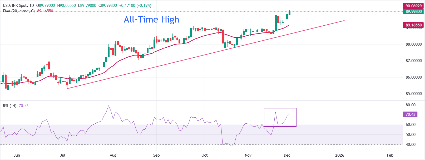在日缐图上,美元/印度卢比在周二欧洲交易时段接近90.00。该货币对稳稳高于89.1655的20天指数移动平均缐(EMA),且更陡的斜率确认了短期上升趋势的增强。回调将会在该均缐附近找到初步支撑。