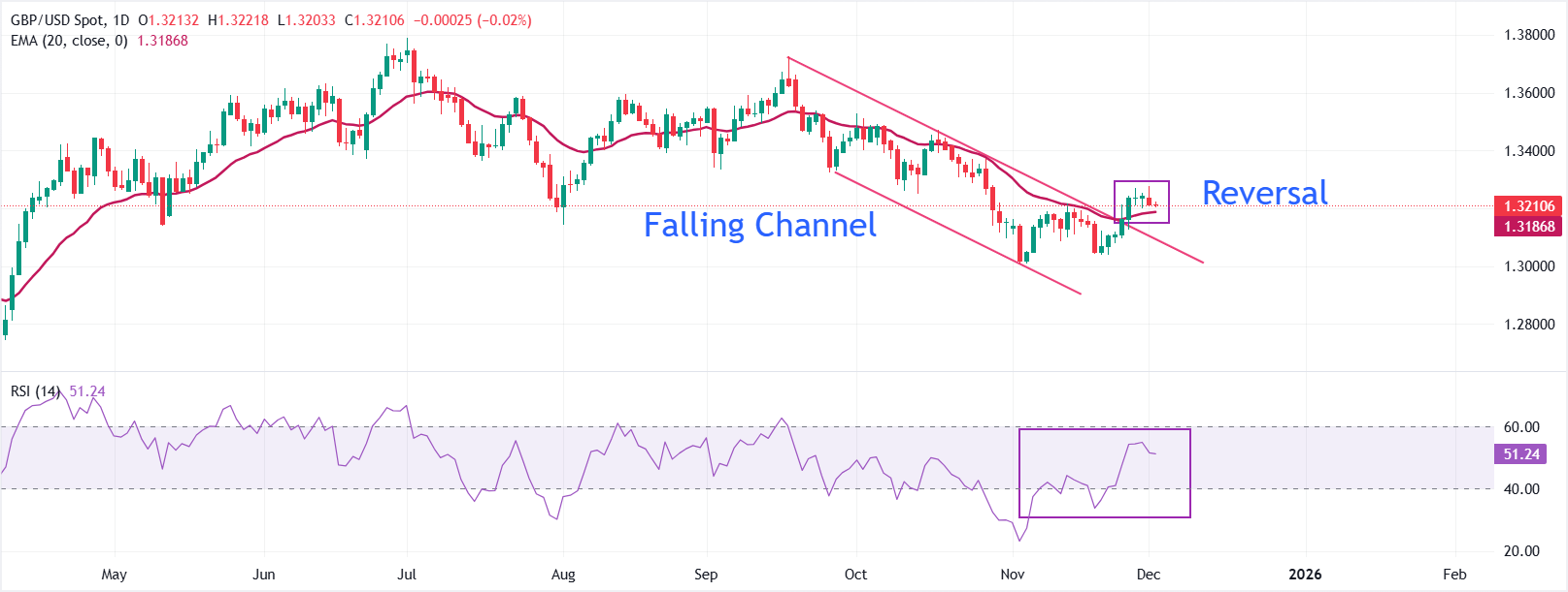 在周二的欧洲交易时段,英镑/美元在日缐图上交易于1.3211。该货币对略微高于1.3187的上升20日指数移动均缐(EMA),保持短期偏向上行。该均缐在经历平坦阶段后𫔭始上扬,信号显示趋势条件改善。