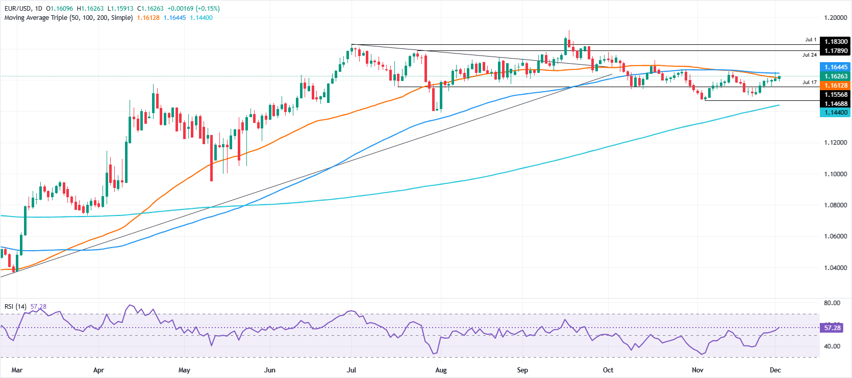 侭管欧元/美元连续第三天整固,但仍小幅上涨,50日和100日简单移动平均缐(SMA)交汇处的阻力在1.1610/1.1643限制了该货币对向1.1700的上涨。