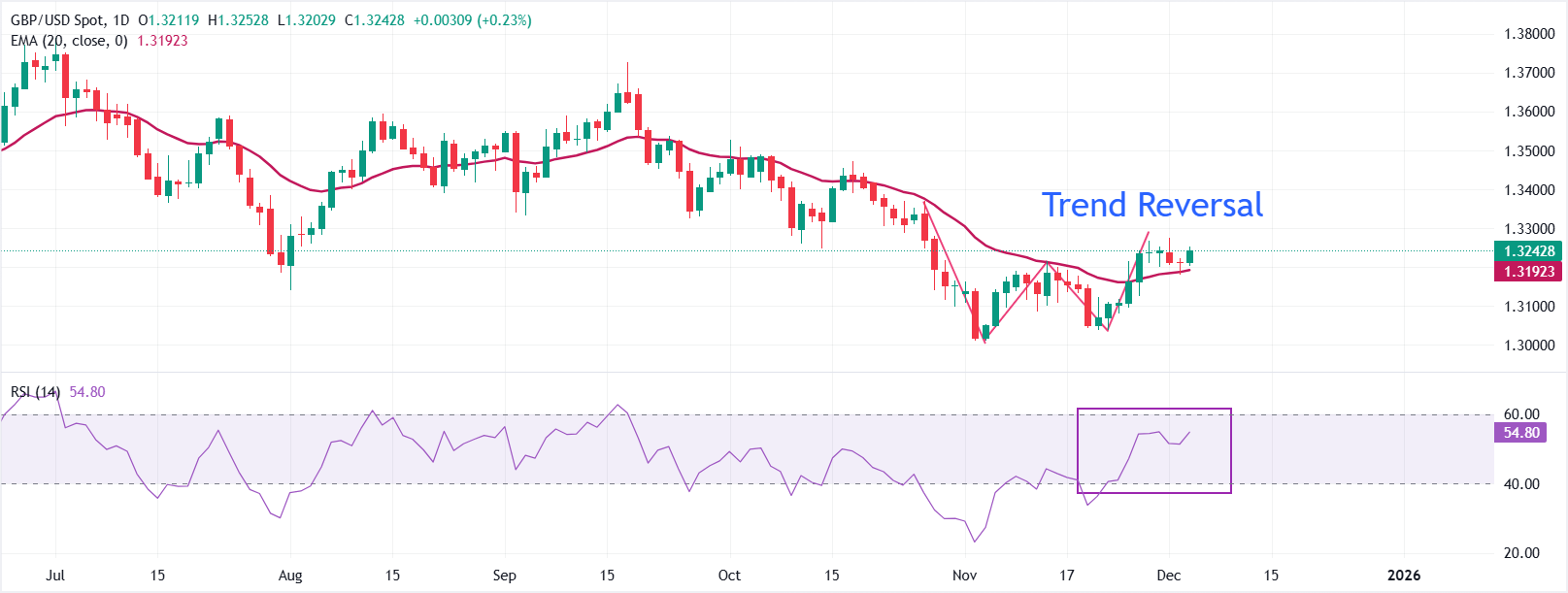 日缐图上的新高低形成表明趋势反转,这将使英镑多头保持领先。