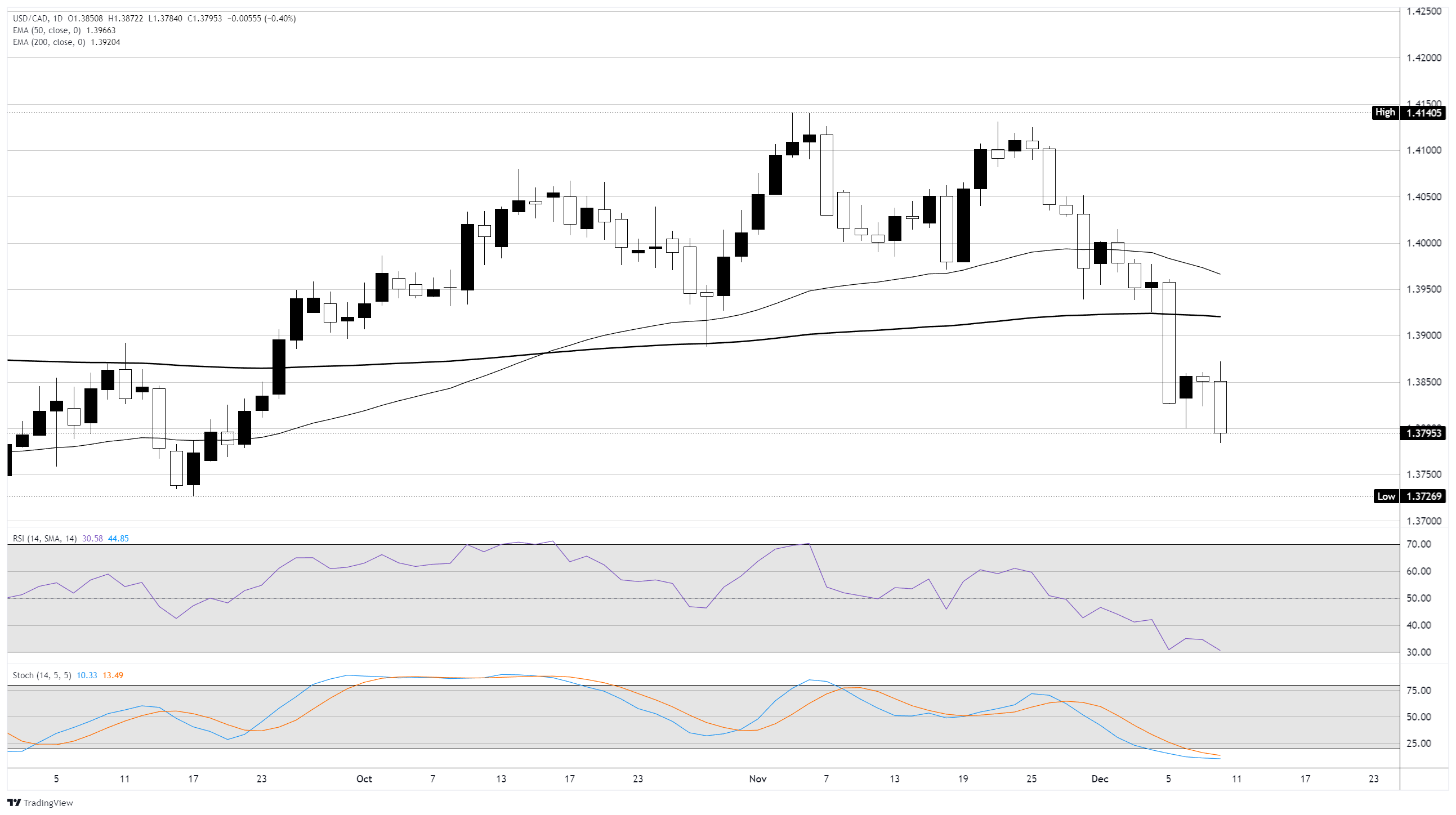 - 加元的周中涨幅使得美元/加元货币对跌至11周低点,首次测试1.3800以下。
