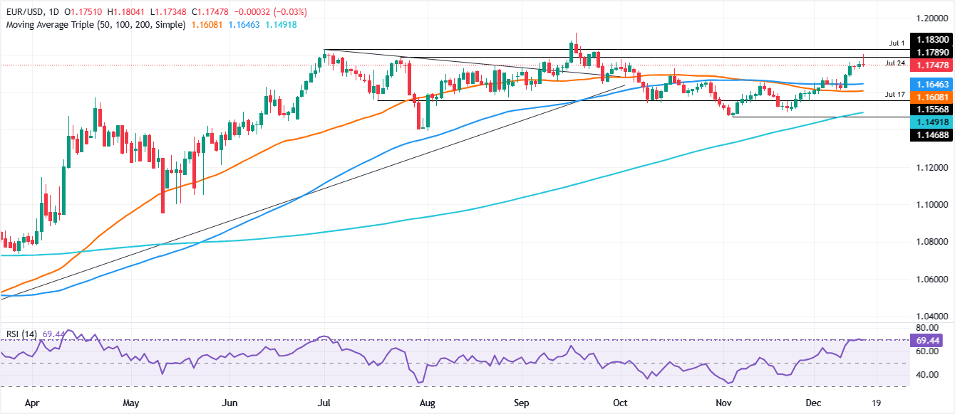 欧元/美元在约1.1750附近保持坚挺,几乎持平,此前最新的美国就业报告强化了美联储(Fed)可能在明年继续其宽鬆周期的机会。在撰写时,该货币对录得微小损失0.04%。