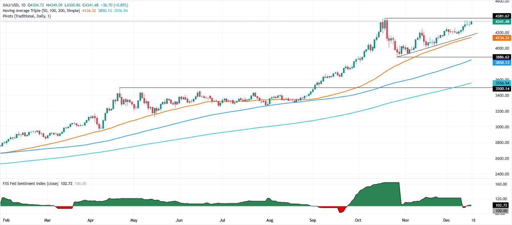 相反,黄金若跌破$4,300,即12月11日的高点转為支撑,接下来将测试$4,285,进一步支撑位在$4,250,之后可能会向$4,200回调。