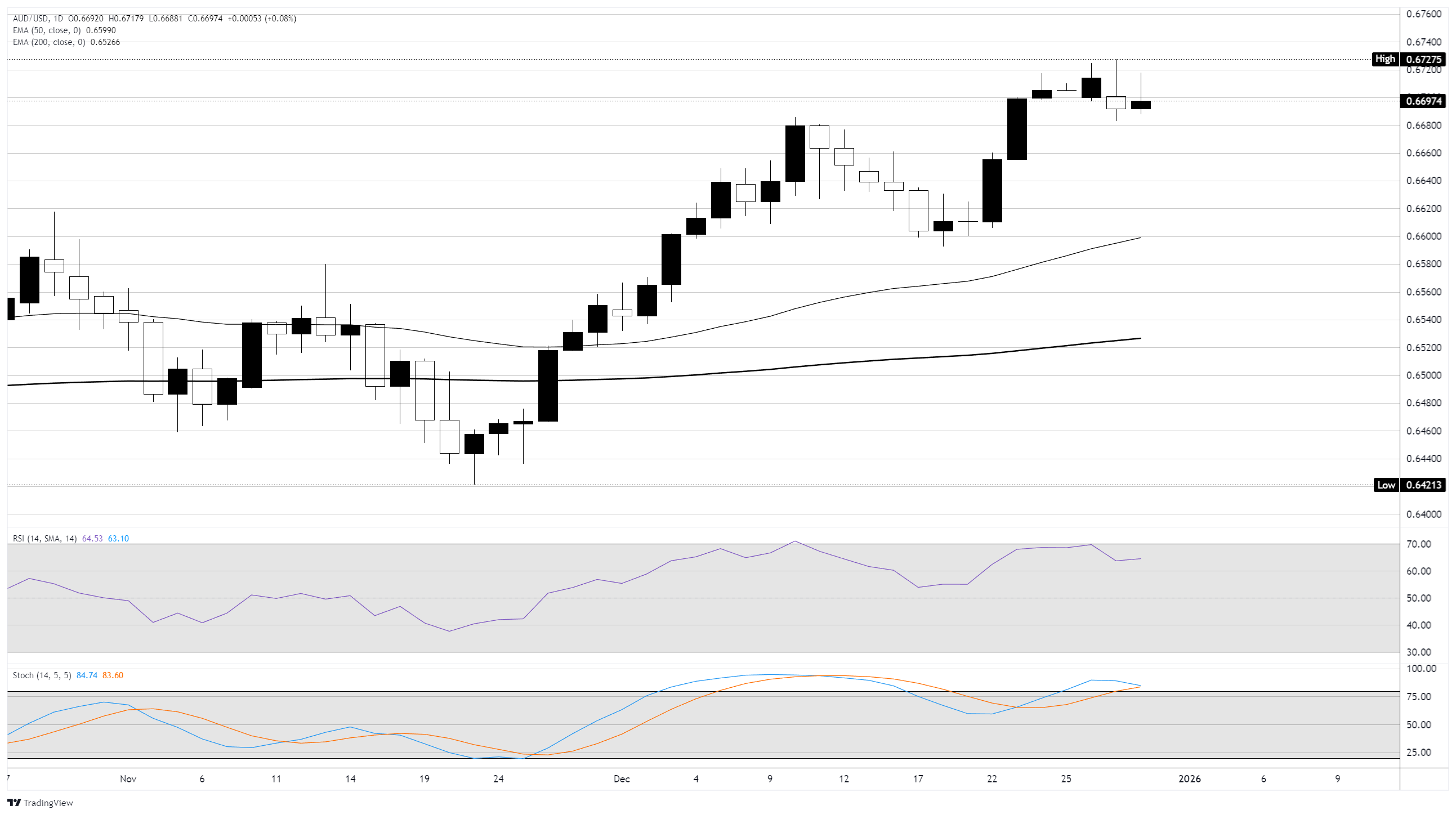 澳元/美元在连续第二天徘徊于0.6700关口,因為澳元-美元配对在年末市场交易量的限制下挣扎。随著澳大利亚储备银行(RBA)逐步迈向新的加息周期,澳元展现出上行趋势,而美元(USD)则因美联储(Fed)鸽派立场面临普遍压力,预计将在2026年进一步降息。