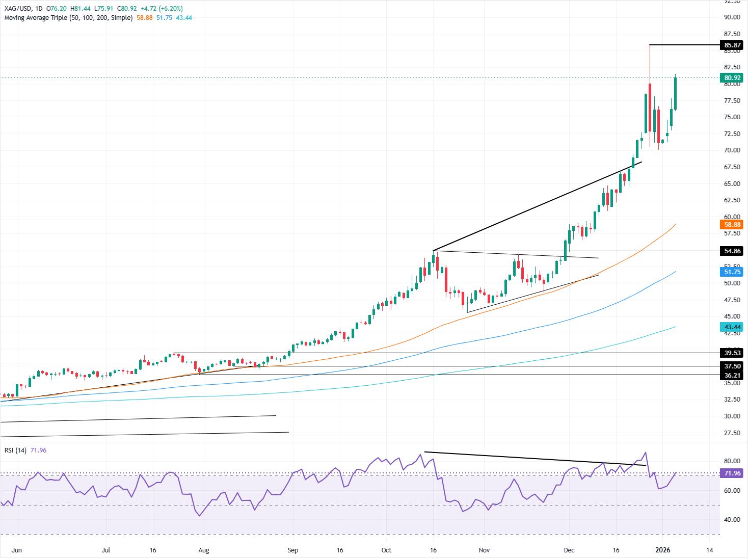 白银价格分析:白银/美元突破80美元,涨势延续