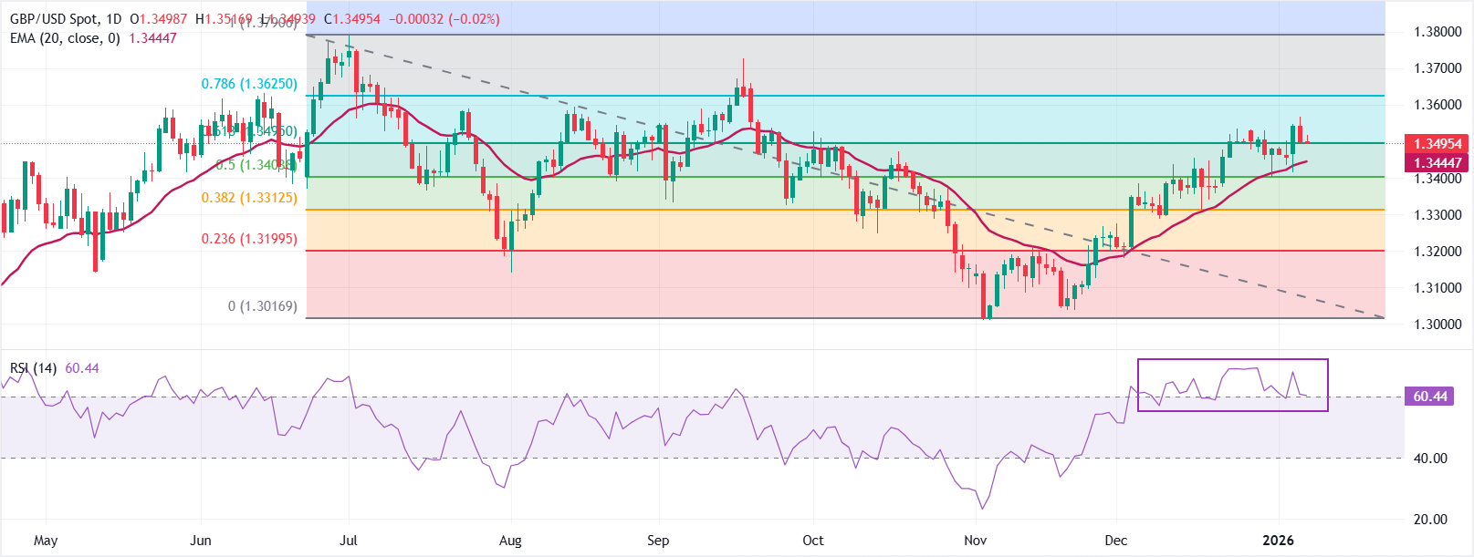 截至发稿时,GBP/USD在1.3495交易。20日指数移动平均缐(EMA)上升并位于1.3445,支撑著短期看涨偏向。价格保持在20日EMA之上,保持短期上升趋势。