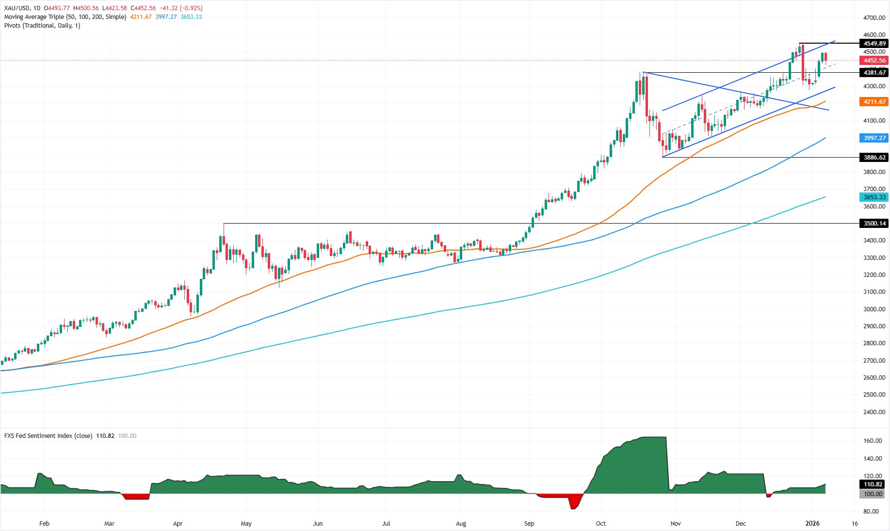 黄金𧹒家测试了4500美元,但未能突破,这加剧了向4450美元区域的回调。动能似乎从看涨转為中性,如相对强弱指数(RSI)所示。