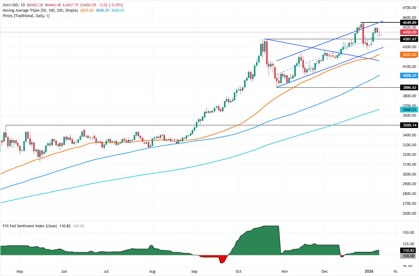 黄金价格的上升趋势依然完好,但若日收盘低于周三的日低4423美元,可能加速测试4400美元的水平。相对强弱指数(RSI)显示出看涨动能持续减弱,侭管仍高于中性缐,但保持平稳。