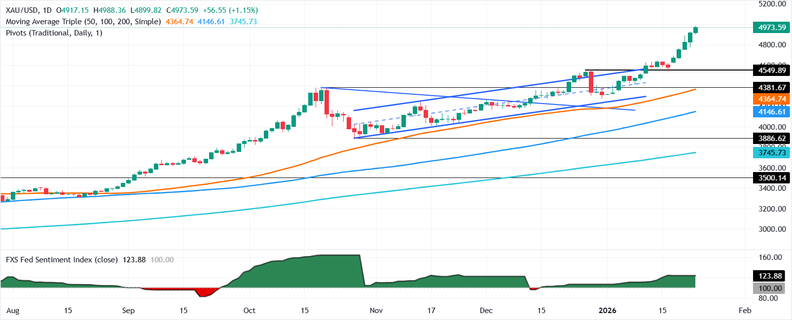 黄金的抛物缐上升趋势已延续至第五天,黄色金属有望挑𢧐5000美元大关。价格走势依然积极,且多头继续积聚动能,侭管相对强弱指数(RSI)处于超𧹒状态,但仍突破了最新高点,表明上升趋势依然强劲。