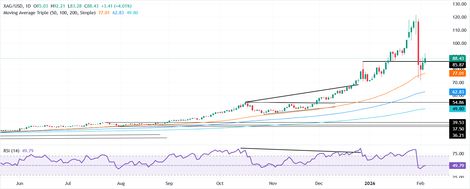 另一方面,如果白银跌破85.00美元,首个支撑位将是84.00美元,随后是2月4日的低点83.28美元。突破后者将暴露50日简单移动均缐(SMA)在77.01美元。