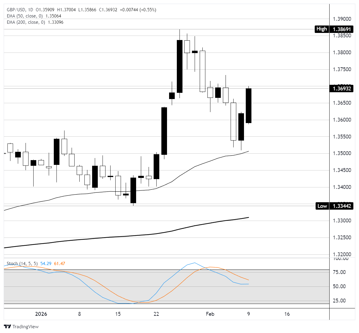英镑/美元在日缐图上保持更广泛的看涨结构,价格远高于50日指数移动均缐(EMA)1.3507和200日EMA 1.3310,确认了自2025年11月接近1.2300的低点以来的中期上升趋势。然而,在英国央行(BoE)以5-4的鸽派投票决定将利率维持在3.75%后,该货币对从1.3869的1月高点急剧回落,四名货币政策委员会成员推动立即下调25个基点。周一的交易中,价格从周五接近1.3600的收盘价反弹至约1.3695,形成了一根看涨的日缐蜡烛,重新夺回了1.3690水平以上的区域。该区域大致与1月下旬在1.3690和1.3770之间的盘整区间相符,此前该区间曾作為支撑位,直到上周的突破。围绕首相斯塔默领导的英国政治不确定性增加了阻力,但日缐时间框架上更高的高点和更高的低点的广泛趋势仍然保持在50日EMA之上。