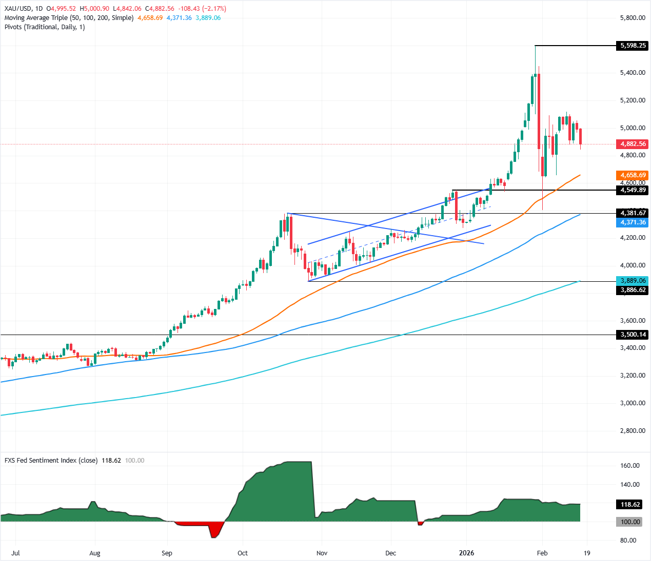 黄金/美元技术展望:在$5,000处挣扎,跌破$4,900