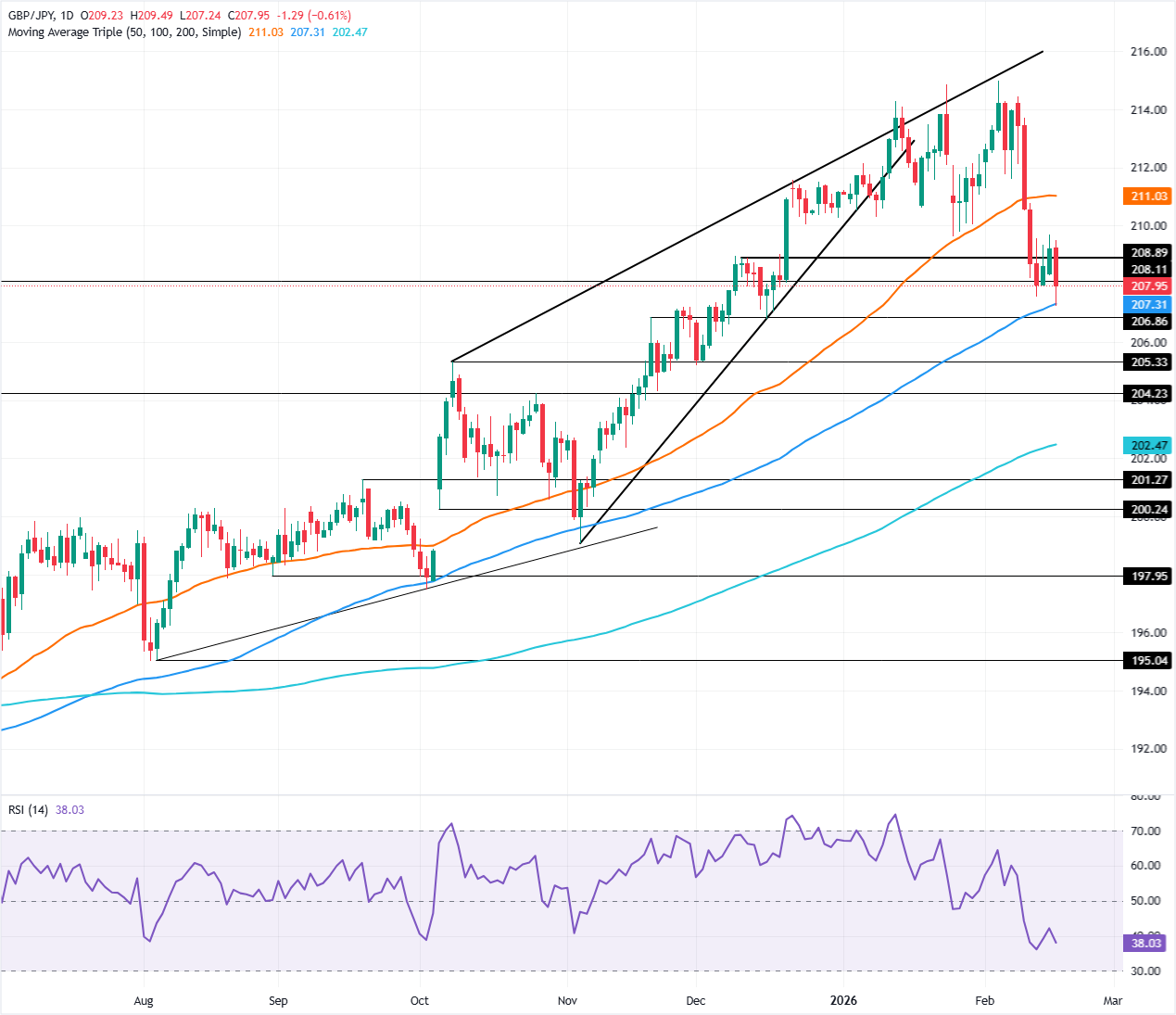 英镑/日元呈中性偏向,但短期内正在测试约207.00-207.30区域的关键支撑趋势缐。与该区域趋近的是100日简单移动平均缐,如果突破,可能加剧向202.39的200日简单移动平均缐的更深回调。