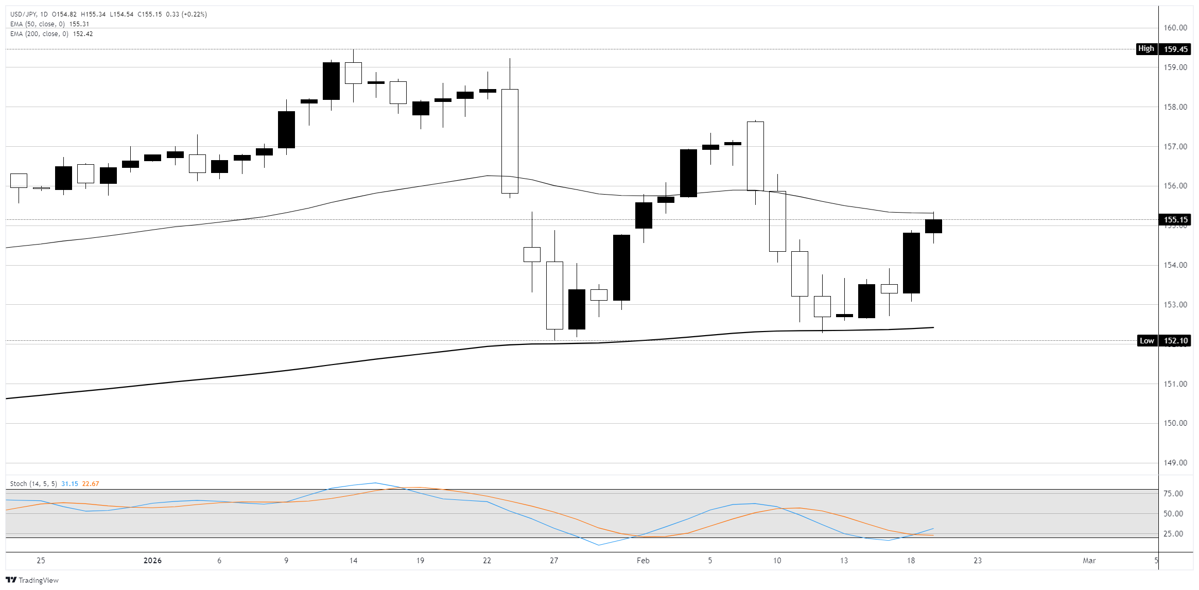 在日缐图上,美元/日元周四接近155.00,位于155.30的50日指数移动平均缐(EMA)下方,刚刚从本月早些时候的152.10年内低点反弹。200日EMA在152.42,继续远低于当前水平,因此自2025年末以来的长期看涨结构仍然有效,但该货币对自1月中旬以来一直在152.00到158.00的区间内波动。从159.45高点到152.10低点的急剧抛售回撤了1月份大部分的反弹,目前该货币对正在争夺50日EMA作為支撑位。随机振盪器在交叉看跌后接近超卖区域,暗示短期下行压力,侭管从该区域反弹与更广泛的区间交易模式一致。最近的交易显示出交替的看涨和看跌蜡烛,且实体逐渐扩大,表明155.00水平附近存在双向波动。阻力位在156.00和158.00区域;若持续突破50日EMA,将目标指向区间的上端。支撑位在153.00和接近152.42的200日EMA,152.10的低点在下方。