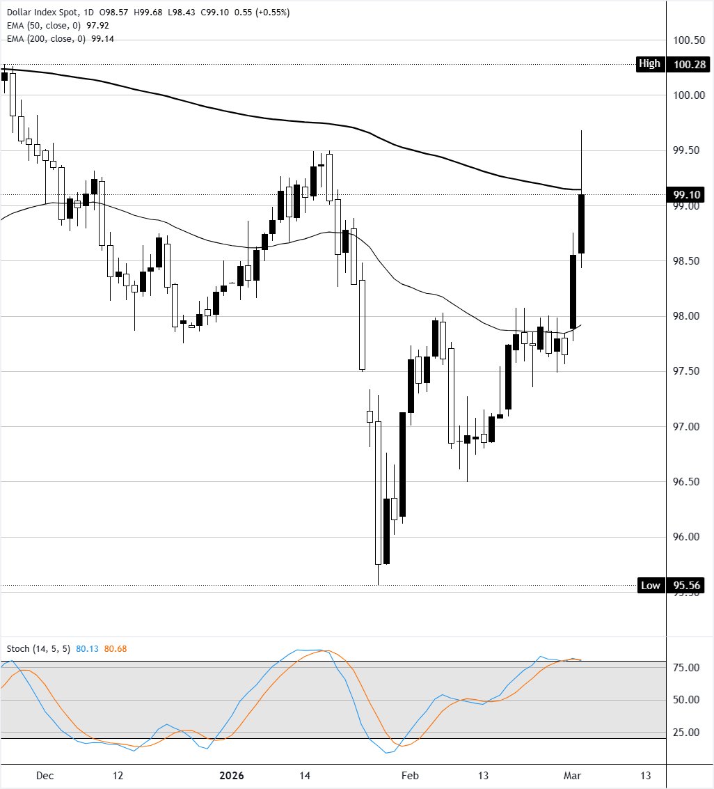 美元指数(DXY)周二上涨约0.55%,攀升至约99.09,延续了周一的急剧上涨。该指数已明确突破了97.00至98.50的盘整区间,该区间在2月份大部分时间内保持不变,周一的强劲看涨蜡烛标誌著几周以来最大的单日涨幅。