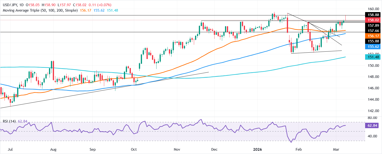 - 跌破157.97将暴露156.45的支撑位和156.15的50日简单移动平均缐(SMA)。