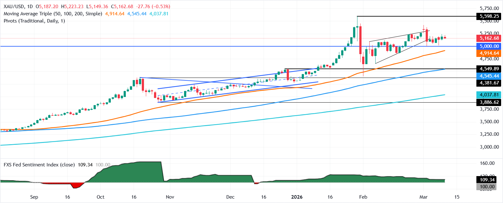 相反,黄金跌破5100美元将打𫔭挑𢧐关键需求水平的路径,包括3月9日的日低5014美元,随后是50日简单移动平均缐(SMA)4896美元。