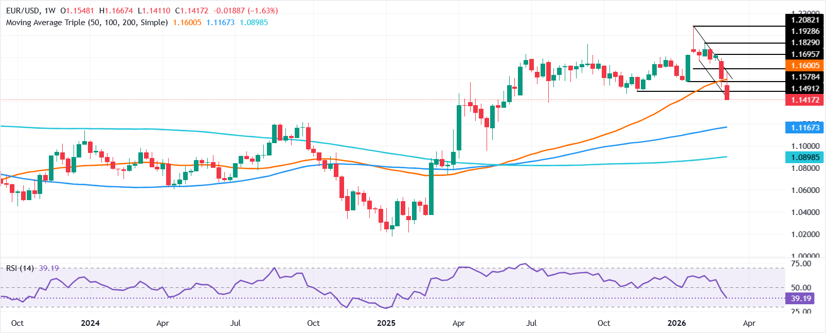 - 欧元/美元本周下跌1.74%,交易接近1.1414,跌破200日简单移动平均缐(SMA)。