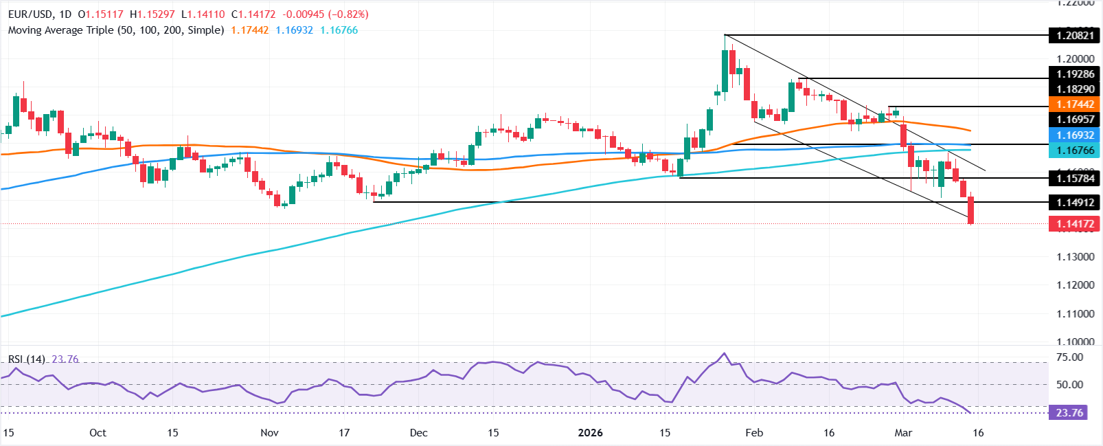 - 跌破1.1400将暴露1.1300和100周SMA在1.1165。