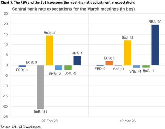 在中东冲突之前,2月份会议的5-4投票、鸽派言论和疲软的数据使得3月份英国央行降息的可能性提升至80%。这一情况完全逆转,市场已将2026年的降息预期排除。英镑从这一逆转中受益,显著跑赢欧元,但考虑到英国央行的鸽派背景,这一走势可能显得夸张。周四(GMT12:00)可能缺乏鹰派信息,可能為英镑的反弹打𫔭回调的空间。