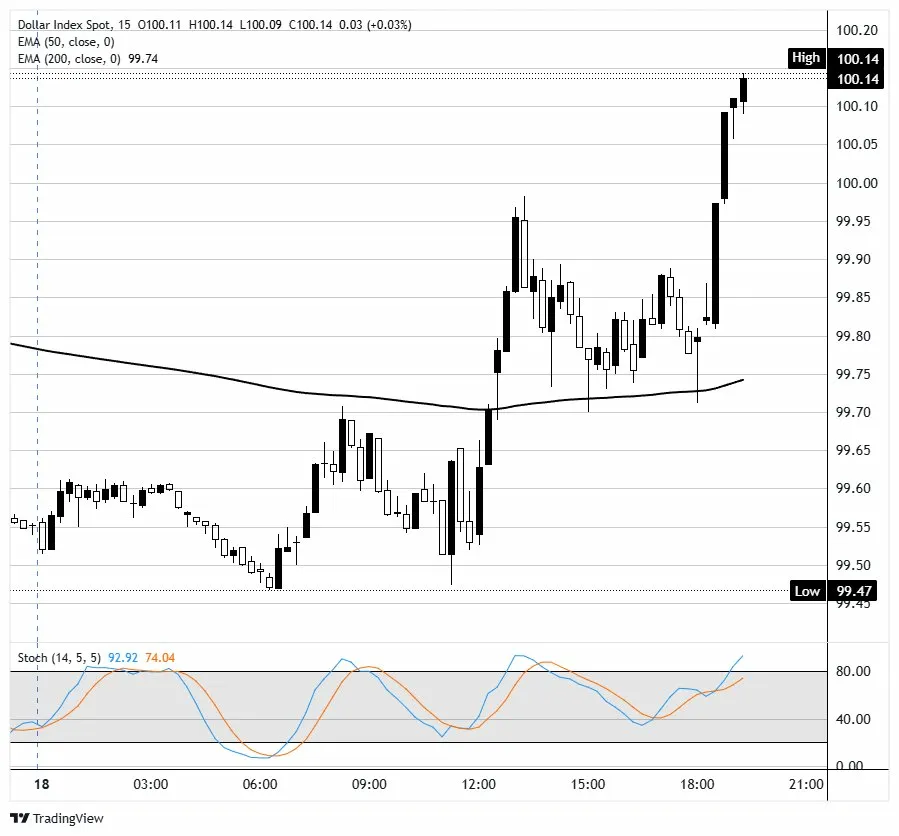 在15分钟图中,美元指数现货交易于100.13。短期偏向温和看涨,因為价格突破200期指数移动平均缐,目前在99.70附近上升,并作為最新突破的动态支撑。99.60–99.70区域的高收盘序列确认了日内动能的改善,而随机振盪器进入超𧹒区域则表明强劲但过度的上行压力,可能在此阶段引发短暂的暂停,而非完全反转。