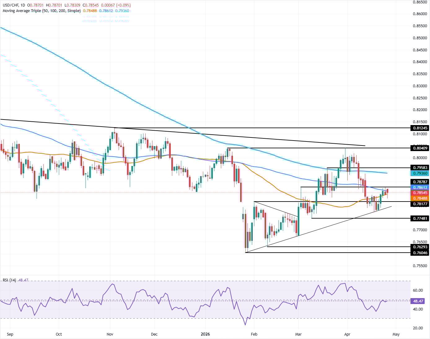 随著北美时段风险偏好改善,美元从日内低点反弹,美元/瑞郎小幅上涨约0.15%。撰写时,该货币对交投于0.7854。